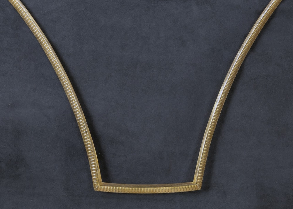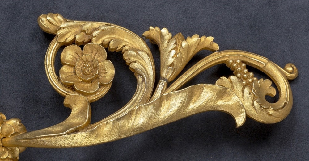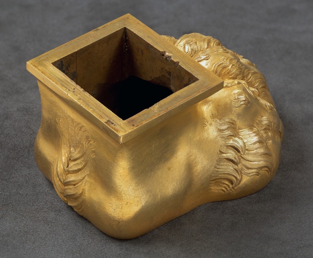 The mounts attributed to Luigi Manfredini (Active in Milan, 1806-1840), surmounted by the original circular verde alpi marble top above a frieze mounted with gilt-bronze patera interposed by berried-laurel leaves centred by a rosette above in the middle a double rim ormolu-mounted baluster, four curved monopodiae legs with lions mask on the top profusely decorated on each side, terminating in gilt bronze lion paw feet raising on a fourfold concave base within a gilt-bronze rim above a frieze. Milan, end first quarter XIX c.
