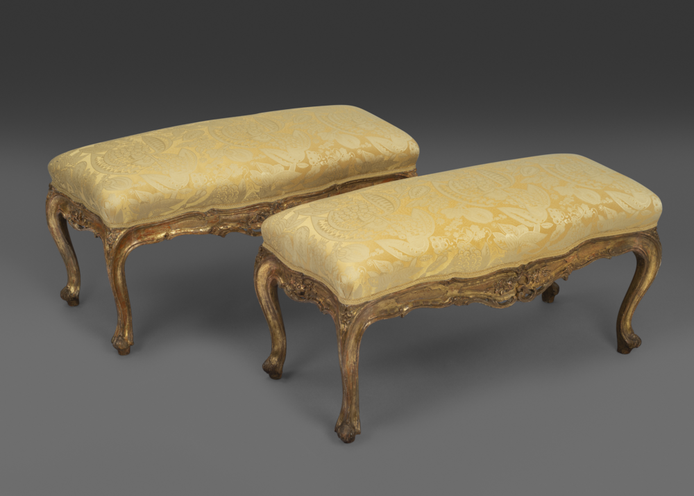 With a serpentine padded seat covered with contemporary lampas, the pierced frieze and cabriole legs elaborately carved with shell motifs, lambrequins and leaves.