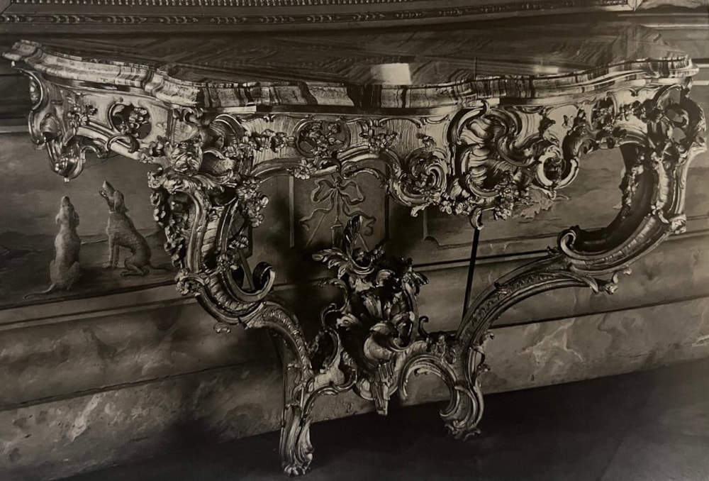 A German Rococò Carved Giltwood Console, with a serpentine veneered Böttinger marble top. Now in the private collection of an important connoisseur in London.