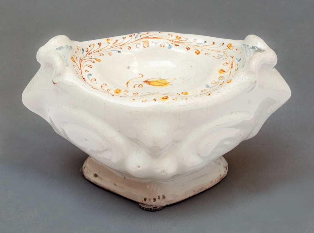 A ‘gran fuoco’ ‘Bianco di Faenza’ tin-glazed earthenware majolica salt cellar, moulded with ram head terminals and scrolls, decorated in the so-called compendiary style, the rim painted with flowers in blue, yellow and orange. Firing hole under the base. Faenza, Italy, ca. 1560.