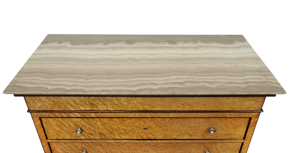 with its coeval rectangular "cipollino" elaborated moulded marble top on blind frieze drawer above three long drawers on a base plinth.