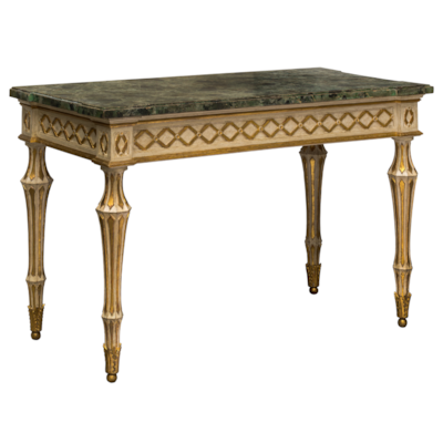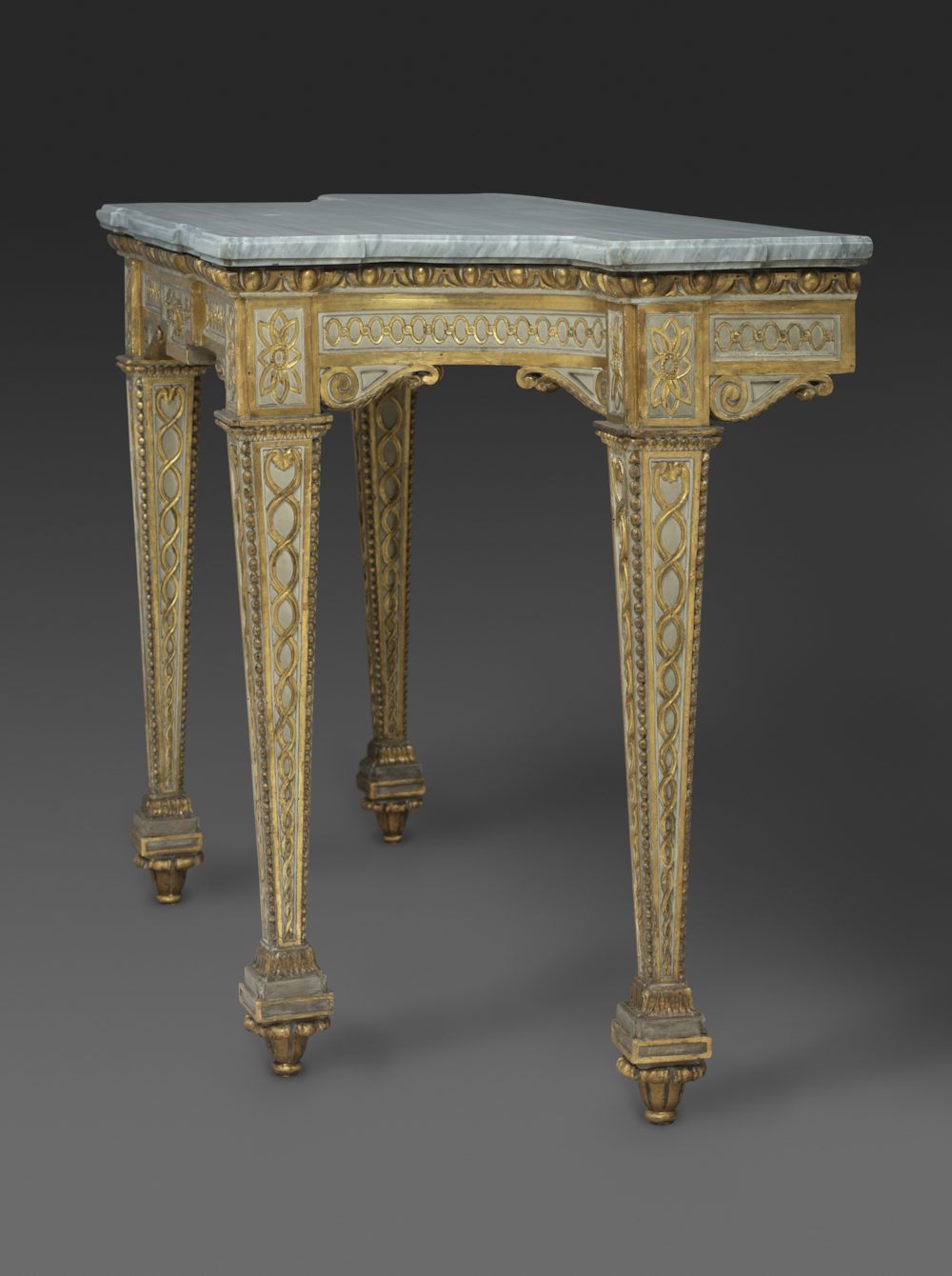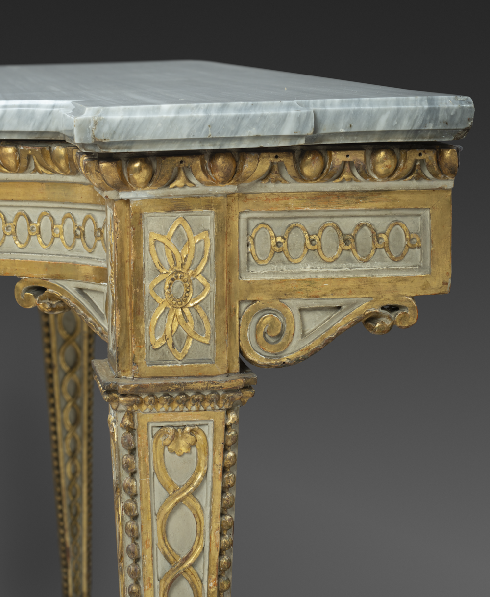 A North-Italian neoclassical creme painted and microcarved parcel gilt-walnut console table with original Grey Valdieri marble top, Turin, 1790 circa
