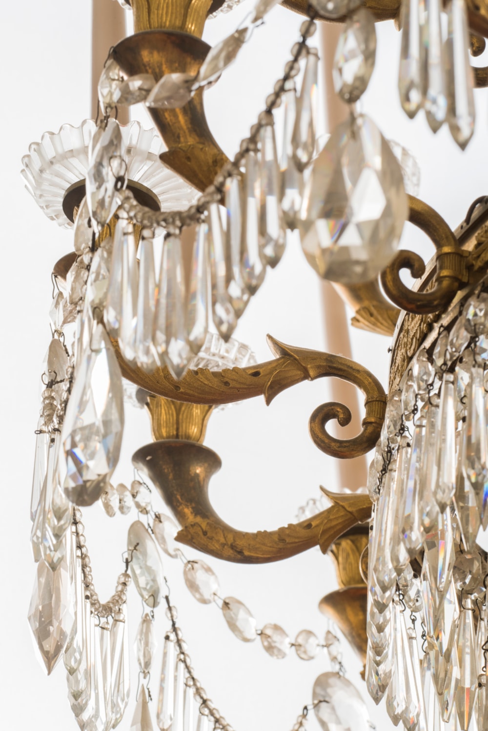 pans. From this ring descend short chains of cut crystal drops that join a second bronze ring adorned with applied reserves with leaf motifs and rosettes, to which are attached eighteen candle branches, below which the central shaft is encased in a 'tent'