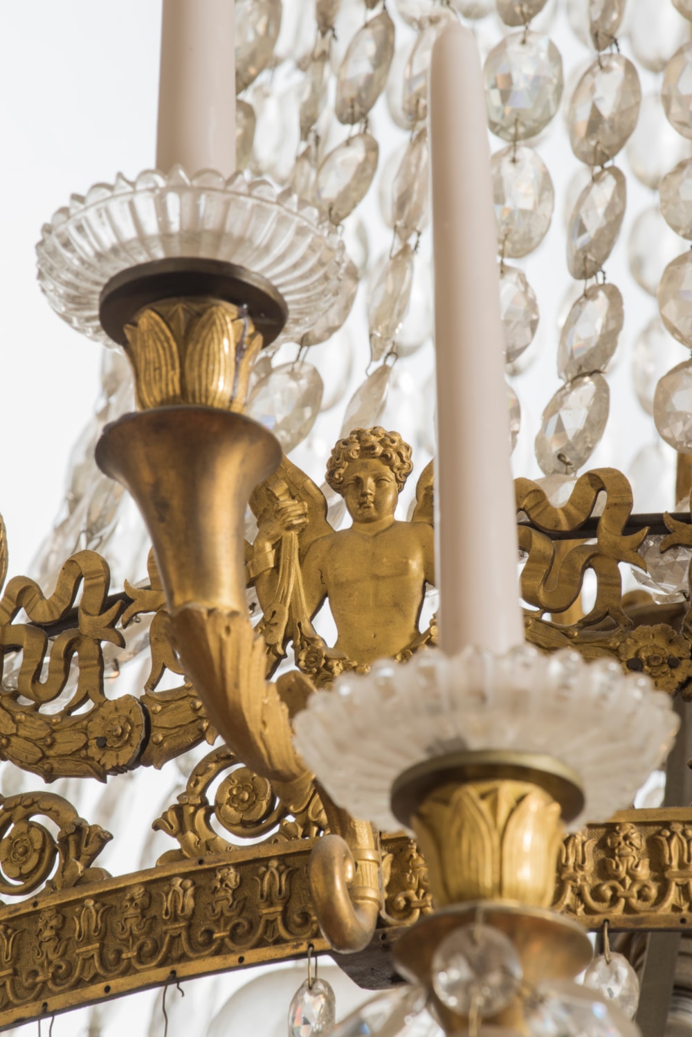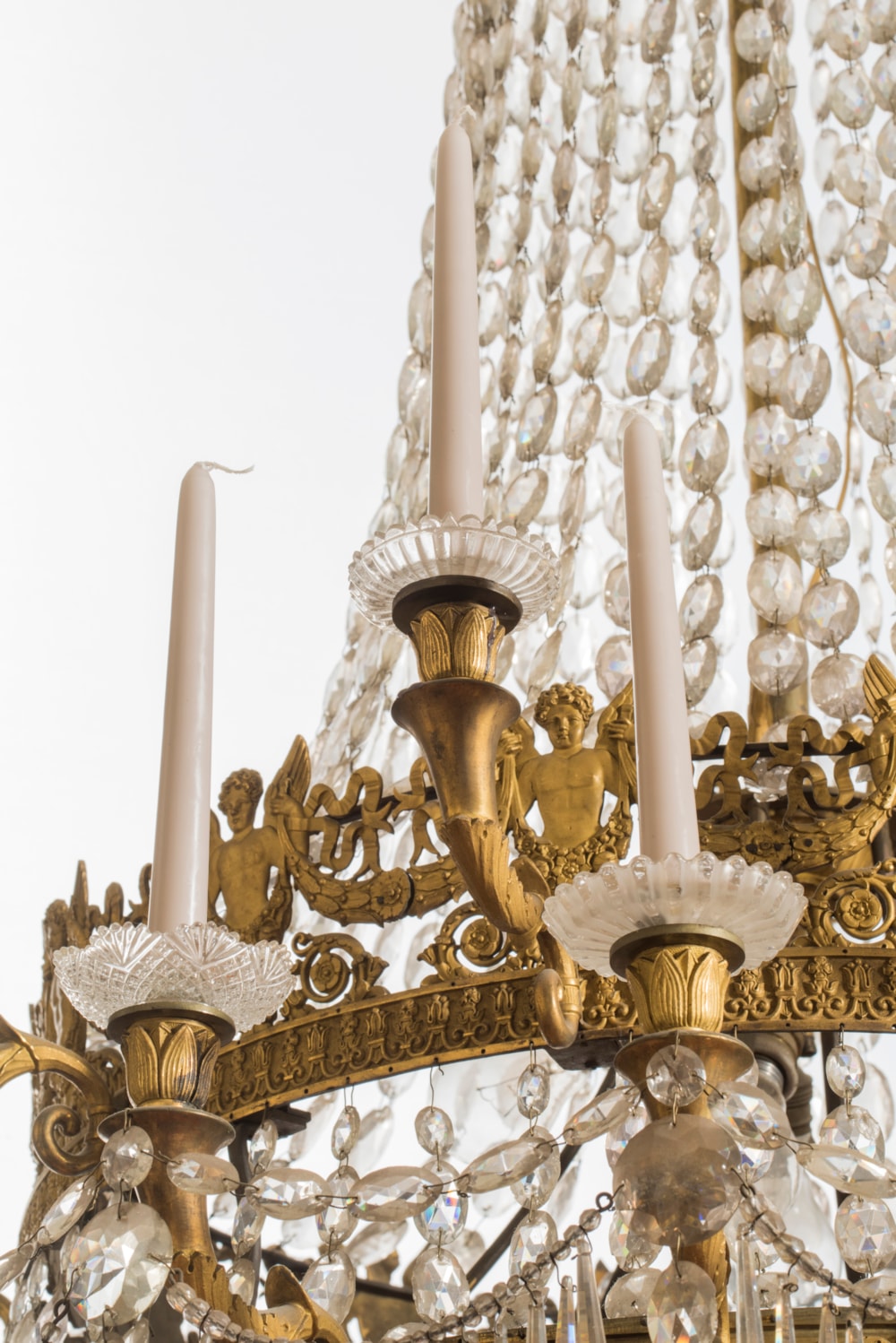 An exceptional Empire ormolu and Mont-Cenis cut-crystal twenty-seven lights chandelier in two rows, attributed to the Maison Chaumont.