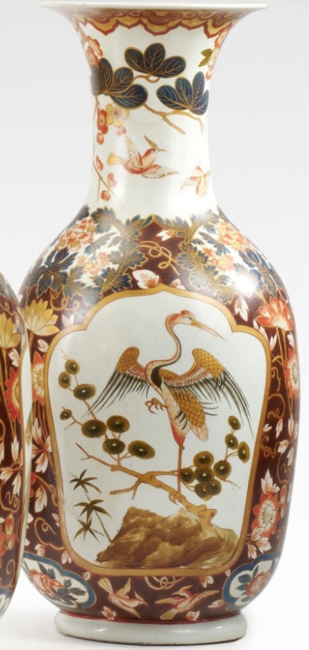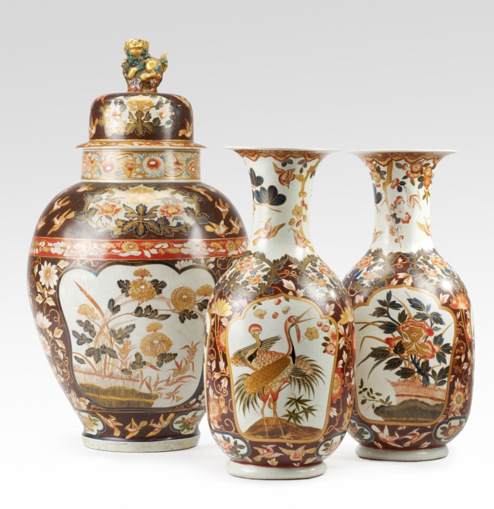A guarniture of three large Imari-style painted terracotta vases each painted in blue, iron-red, white and gilding with panels of birds or foliage against a deep red ground, comprising: a pair of baluster vases and a central ovoid vase and domed cover, the domed lid with a Buddhist lion finial, painted overall with birds and chrysanthemum, peony and prunus blossoms in a red, gold and cobalt blue palette on a brown ground, circa 1765. The lacquer decoration on these vases, imitating the Japanese Imari palette, is similar in execution to the decoration in the Chinese taste on a lacquer tray and a pair of lacquered tôle vases both attributed to Christian Wehrlin, and both previously with Pelham Galleries. All these objects share the same fine craquelure surface and are decorated with flowers and birds treated in a highly individual manner that must be by the same hand. Christian Wehrlin, originally from a Nuremberg family of artists, from 1756 to 1774 worked at the court of the Kings of Savoy and his masterpiece is the 1765 decoration of the Sala da Gioco in the Appartamento di Levante (Chinese East Apartment) in the royal hunting palace of Stupinigi, outside Turin.