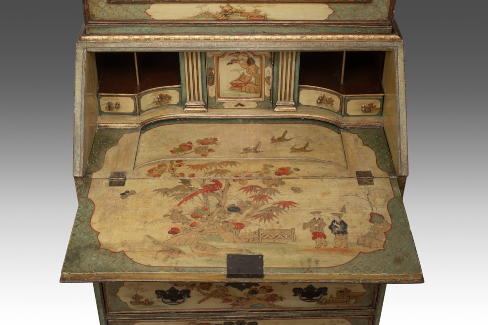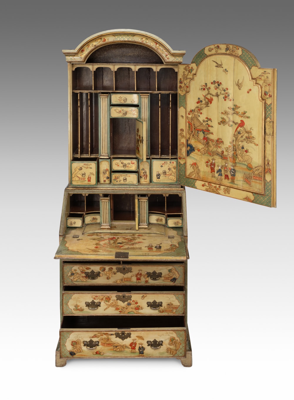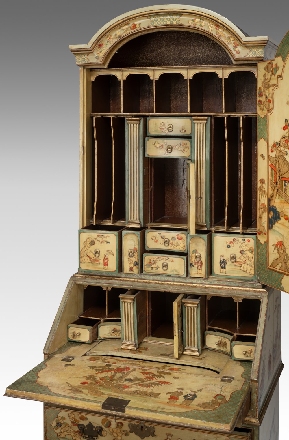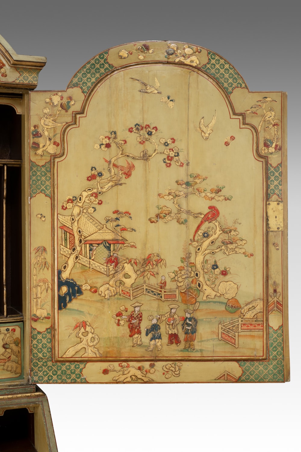 A small George I, white, polychrome and gilt Japanned bureau cabinet, in pine and oak wood, possibly decorated in Edinburgh or in Germany by an English japanner.