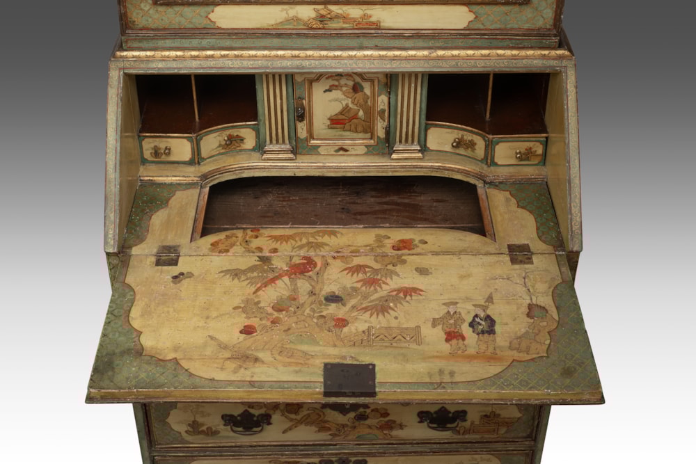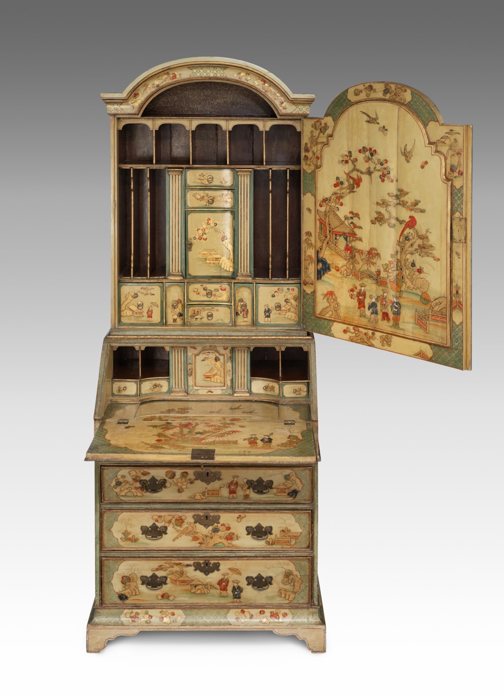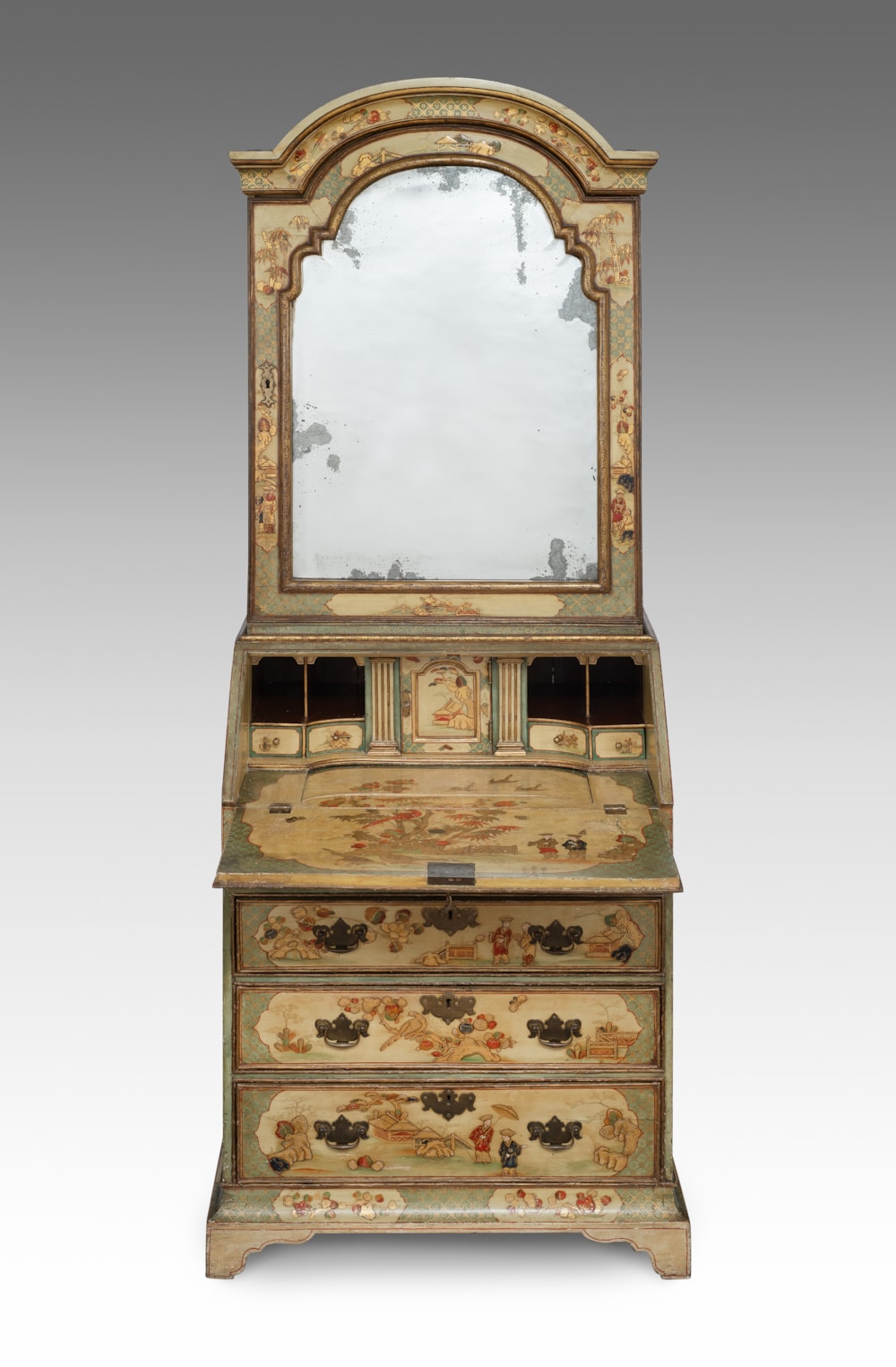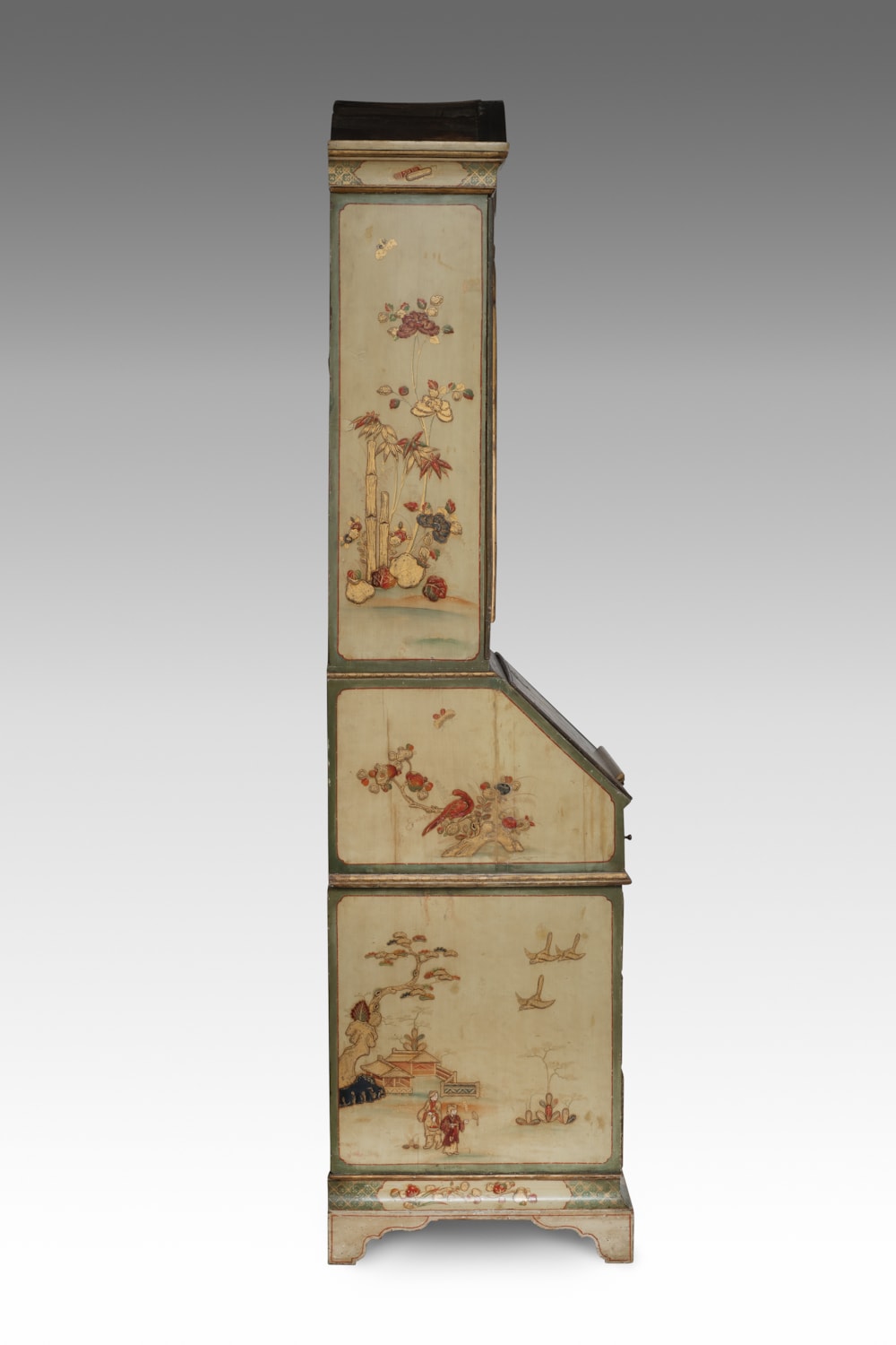 A small George I, white, polychrome and gilt Japanned bureau cabinet, in pine and oak wood, possibly decorated in Edinburgh or in Germany by an English japanner.