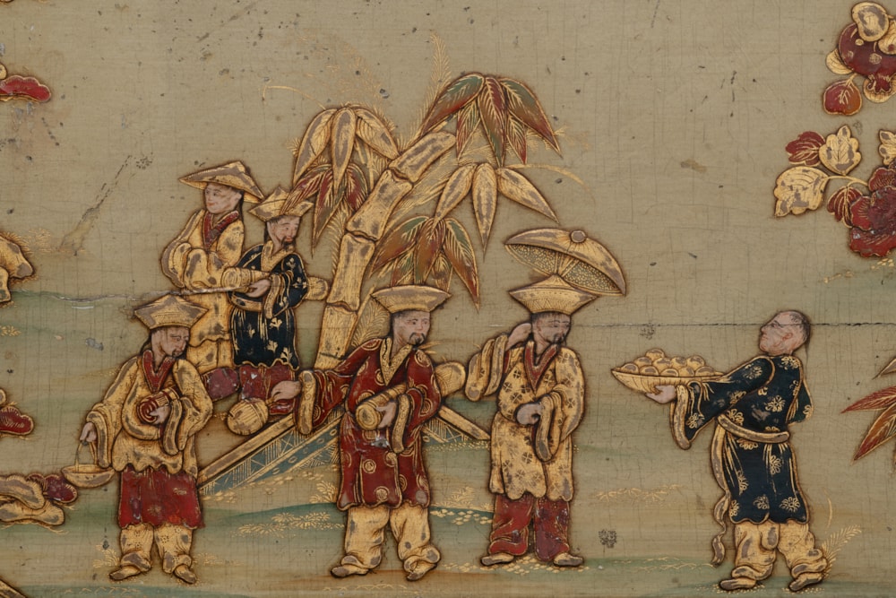 Throughout decorated with scenes of Chinoiserie depicting exotic birds, flowers,